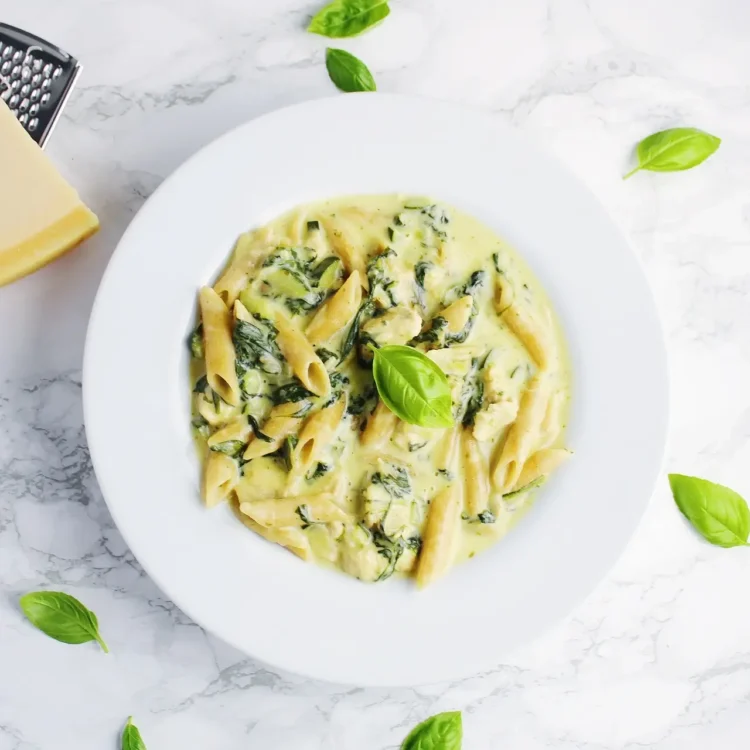 Start med at skære kyllingekødet i små tern, hvorefter du blander krydderierne op sammen med lidt olie (olivenolie, evt.). Steg herefter kødet på panden. Sæt en gryde med let saltet vand i kog. Mål mælk op i et bæger og put smøreosten op i. Rør godt sammen. Tilsæt herefter krydderierne til saucen. Når kyllingekødet er stegt, tilsæt saucen og lad det simre ved lav varme. Vask og hak din ønskede mængde spinat og put det i panden med saucen og kyllingen. Når vandent koger, tilsæt pastaen og lad det koge til pastaen bliver al dente. Når pastaen er færdig, hæld det i panden og rør godt rundt.